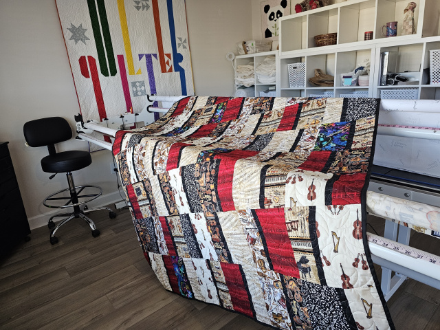 First quilt done in South Carolina. Just a really easy patten using 10 inch squares. A birthday present for a musical friend. Longarm up and running like a champ thanks to Tops Vacuum and Sewing for moving it from my old house and setting it up in the new one. So fun to be sewing again!